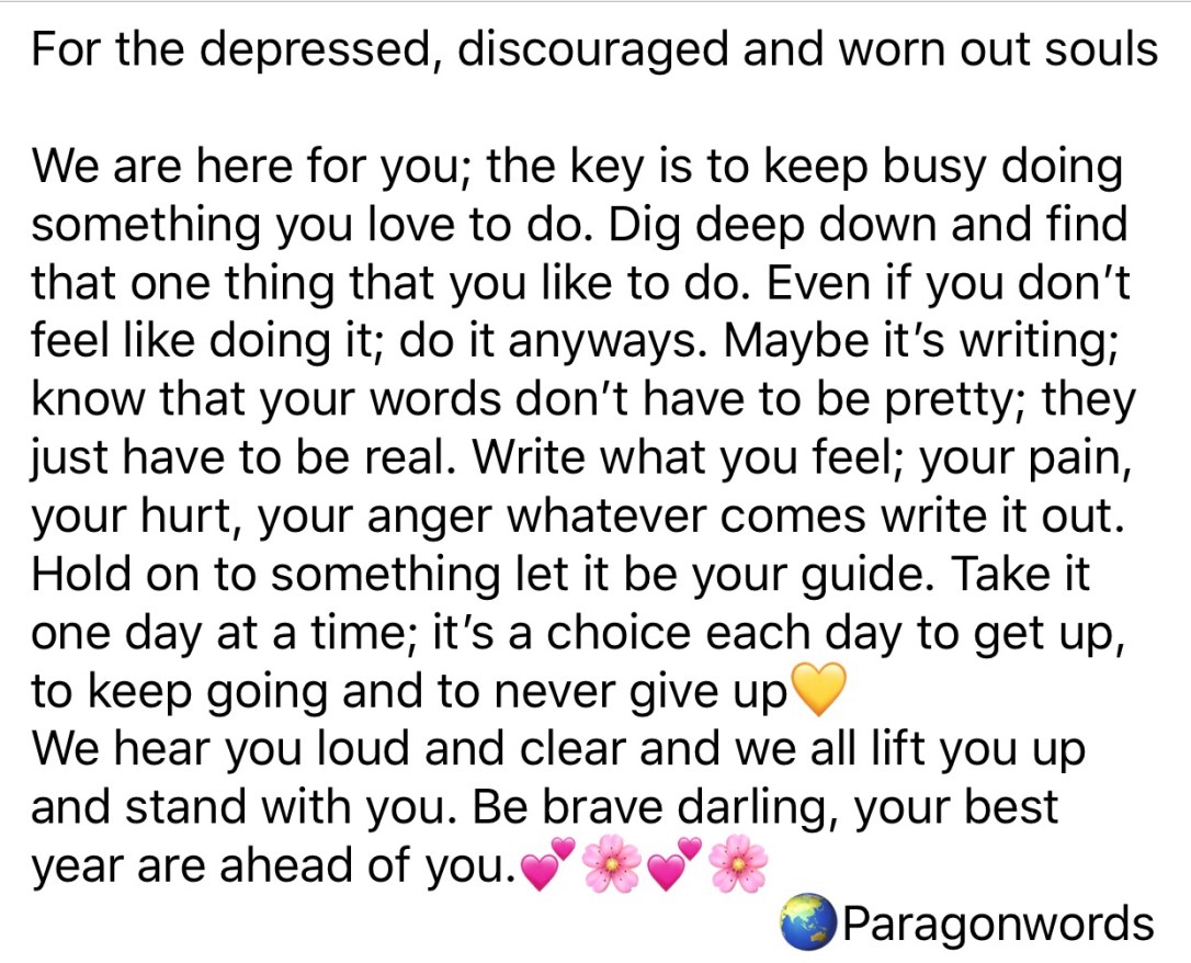 Poetry TodayFor the depressed, worn out souls…. July 14, 2018 Paragonwords Share this: Share on Facebook (Opens in new window) Facebook More Share on LinkedIn (Opens in new window) LinkedIn Share on Pinterest (Opens in new window) Pinterest Share on Bluesky (Opens in new window) Bluesky Share on WhatsApp (Opens in new window) WhatsApp Email a link to a friend (Opens in new window) Email Like Loading...