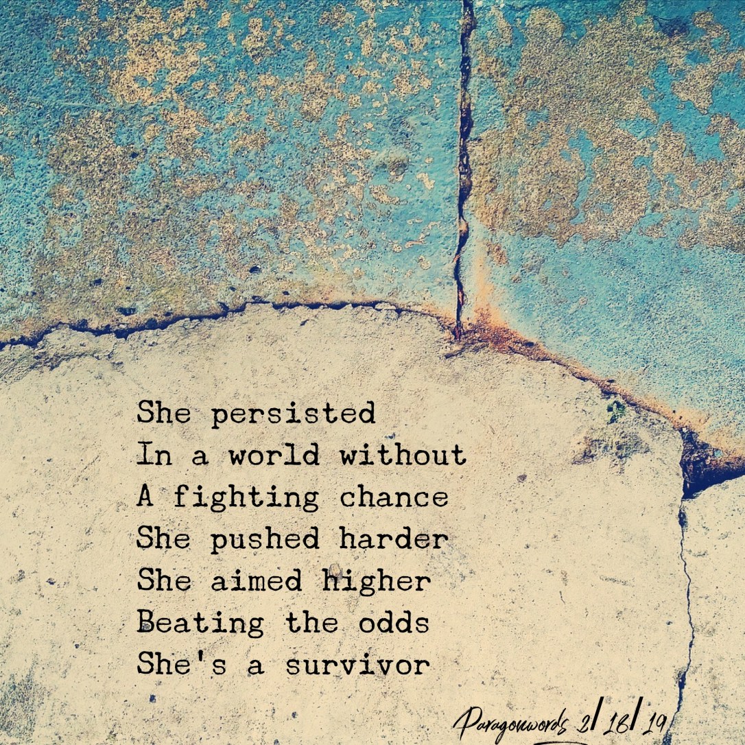 Poetry TodayShe Persisted… February 26, 2019 Paragonwords In a world Without a fighting chance… Share this: Share on Facebook (Opens in new window) Facebook More Share on LinkedIn (Opens in new window) LinkedIn Share on Pinterest (Opens in new window) Pinterest Share on Bluesky (Opens in new window) Bluesky Share on WhatsApp (Opens in new window) WhatsApp Email a link to a friend (Opens in new window) Email Like Loading...